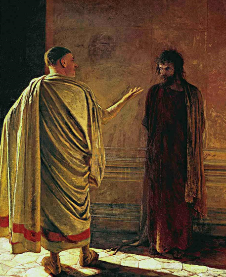 Resim: Nikolai Ge Hakikat Nedir? İsa ve Pilate Bu resmin konusu Yuhanna’ya göre İncil’in 18. bölümünden alınmıştır. İsa’nın: “… bu nedenle dünyaya geldim, gerçeğe tanıklık etmeliyim” sözlerine karşılık, Pontius Pilate “Gerçek nedir?” diye sorar. Sanatçı, Mesih’i duvarı arkasına almış ve bir sütun veya bir ağaç gövdesi gibi sağlam bir şekilde ayakta durur pozisyonda tasvir eder. Pilate figürü ise güneşli zemindedir ve bir pagan idolüne benzer. Ana karakterler parlak bir ışık izi ile bölünür. Leo Tolstoy, bu tablo hakkında sevinçle şöyle yazar: “Mesih ve dünya arasında barış olamaz ve bu tarih için doğru olduğu gibi zamanımız için de doğrudur.”