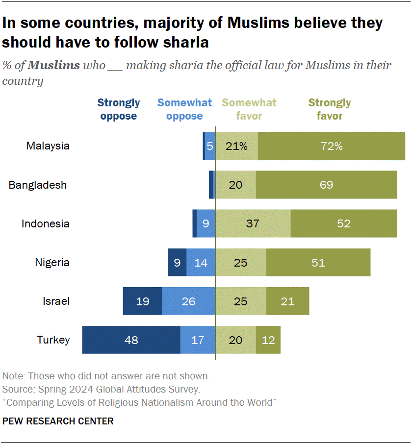 Bangladeş, Endonezya, Malezya ve Nijerya’daki Müslümanların büyük çoğunluğunun, ülkelerindeki Müslümanlar için şeriat veya İslam hukukunun resmi hukuk olması gerektiğine inandığını görüyoruz. İsrail ve Türkiye’deki Müslümanların çok daha küçük bir kısmı ise bu görüşe katılıyor.