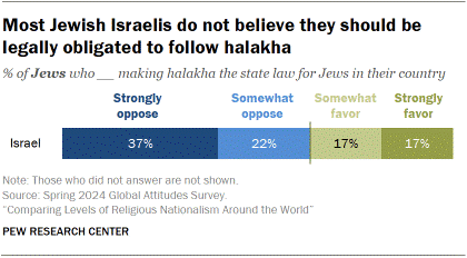 İsrailli Yahudilerin yaklaşık üçte biri, Yahudiler için Yahudi yasalarına dayalı bir hukuk sistemini desteklediğini söylerken, yaklaşık onda altısı böyle bir sisteme karşı çıkıyor. %37’lik bir çoğunluk ise halakha’ya yasal olarak bağlı olmaya şiddetle karşı çıkıyor .