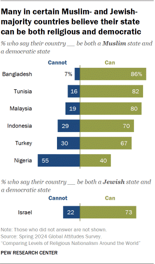 Müslüman çoğunluğa sahip ülkelerde, çoğu kişi devletinin hem demokratik hem de Müslüman olabileceğini düşünüyor. Bunu söyleyenlerin oranı özellikle Bangladeş (%86), Tunus (%82) ve Malezya’da (%80) yüksek. (İslam, Bangladeş ve Malezya’da resmi devlet dinidir ve 2022 yılına kadar Tunus’ta da resmi dindi .)