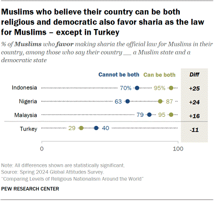 Ülkelerinin hem Müslüman hem de demokratik olabileceğini söyleyen Endonezya, Malezya ve Nijerya’daki Müslümanların, aksini söyleyen Müslümanlara göre, aynı dini paylaşanlar için şeriatın yasa haline getirilmesini destekleme olasılığı daha yüksek.